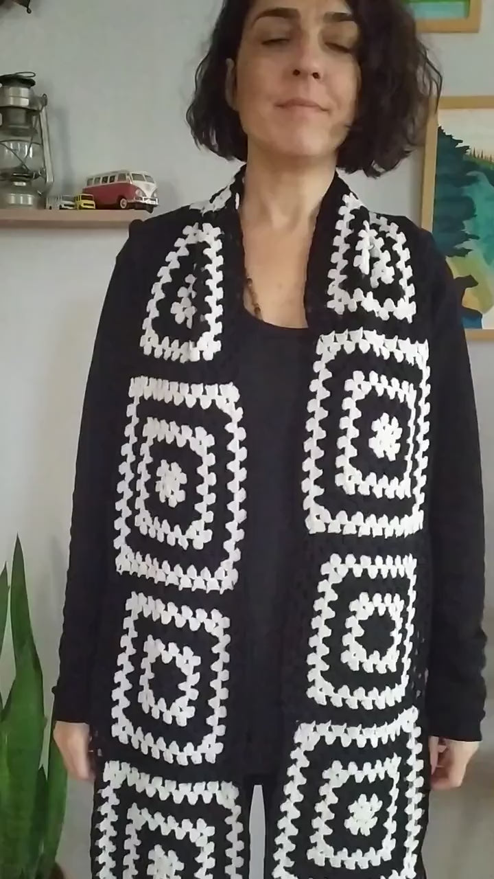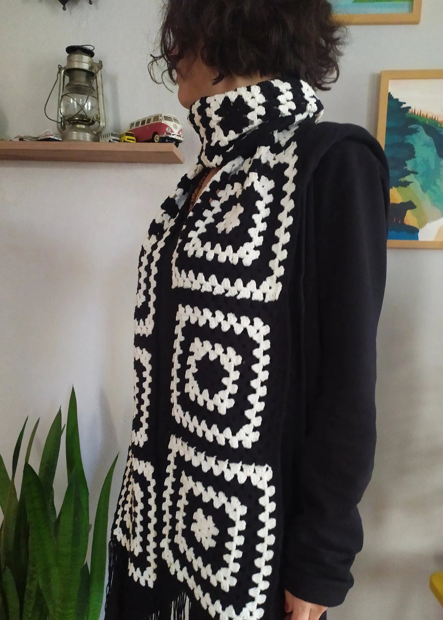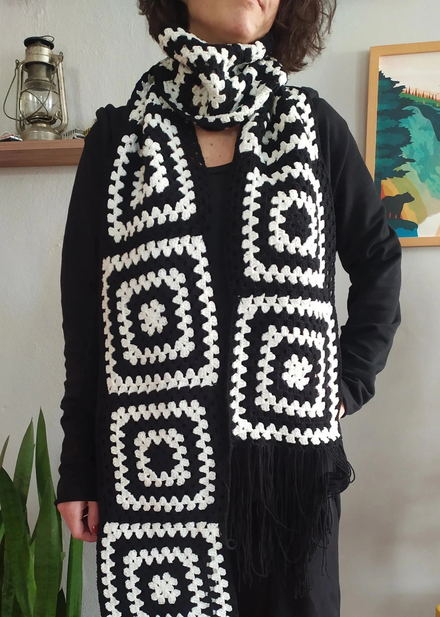 The black and white long granny square knitted scarf will keep you warm throughout the winter and add elegance to your clothes.