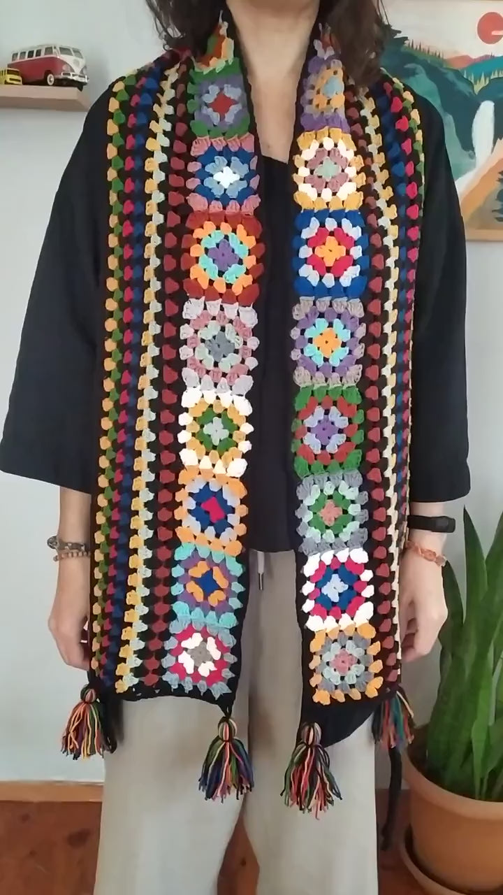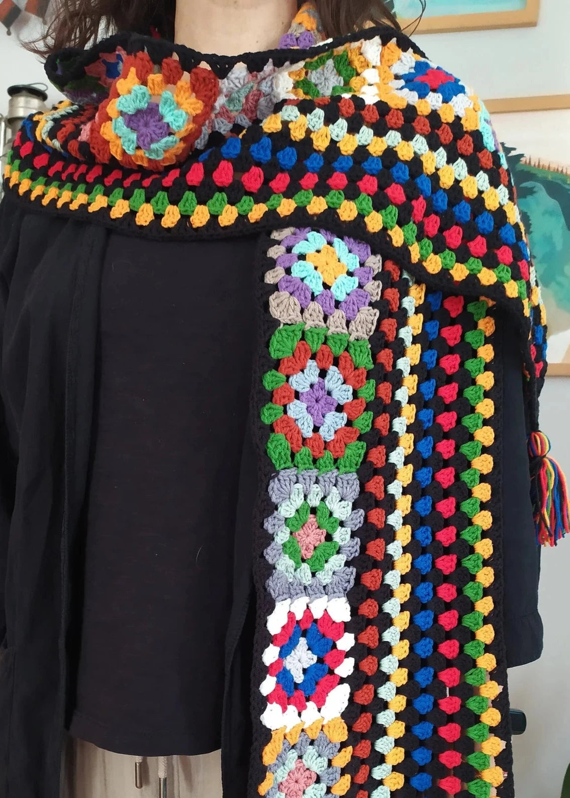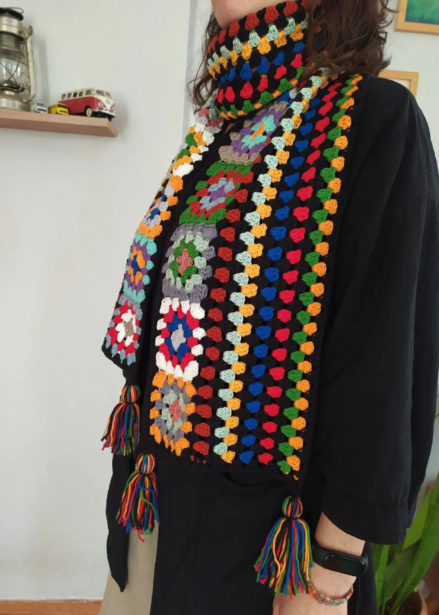 Black Granny Square Scarf, Long Winter Retro Knit Scarf, Colorful Retro Scarf, Knit Weft, Crochet Woman Scarf, Christmas Gift For Her