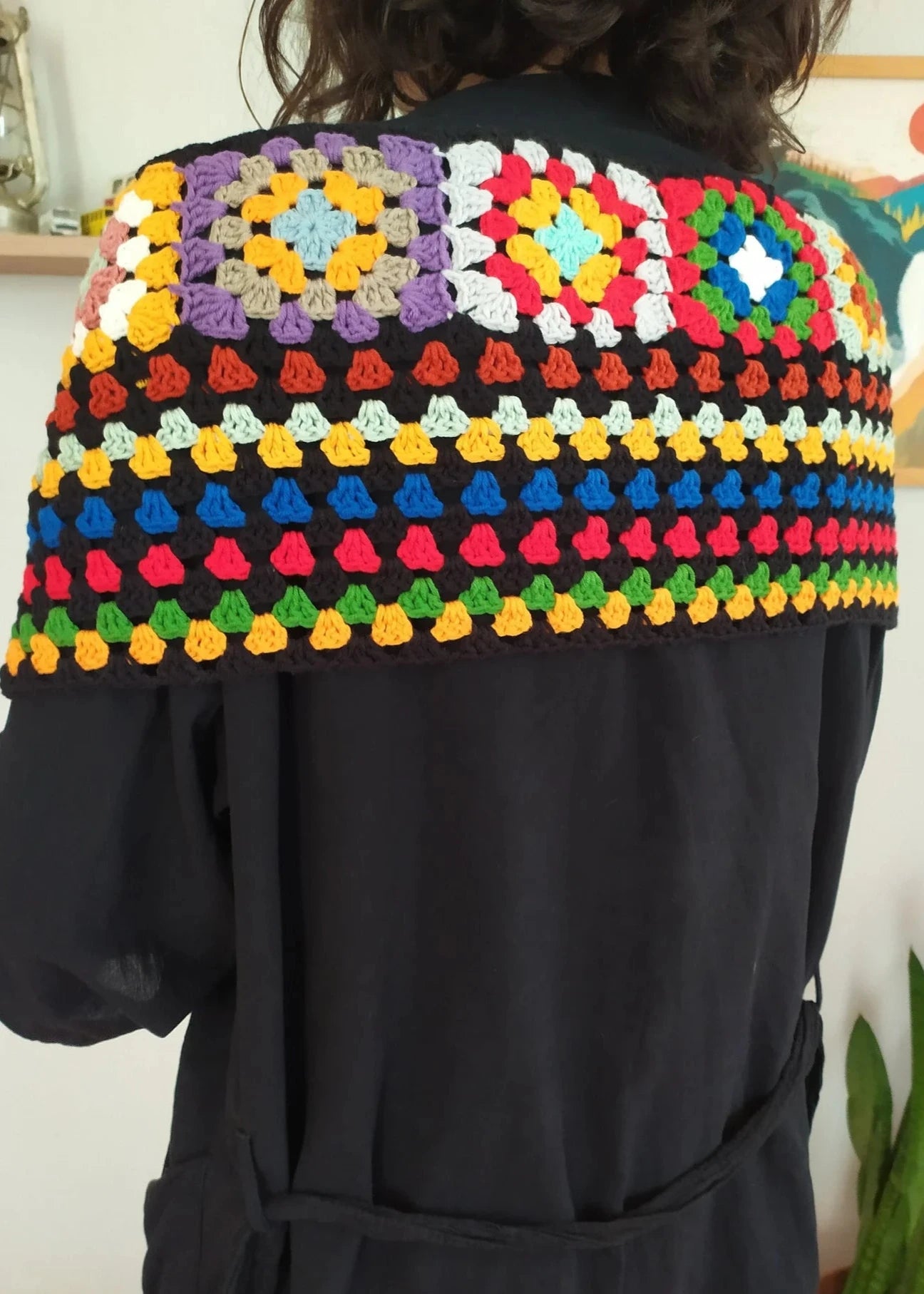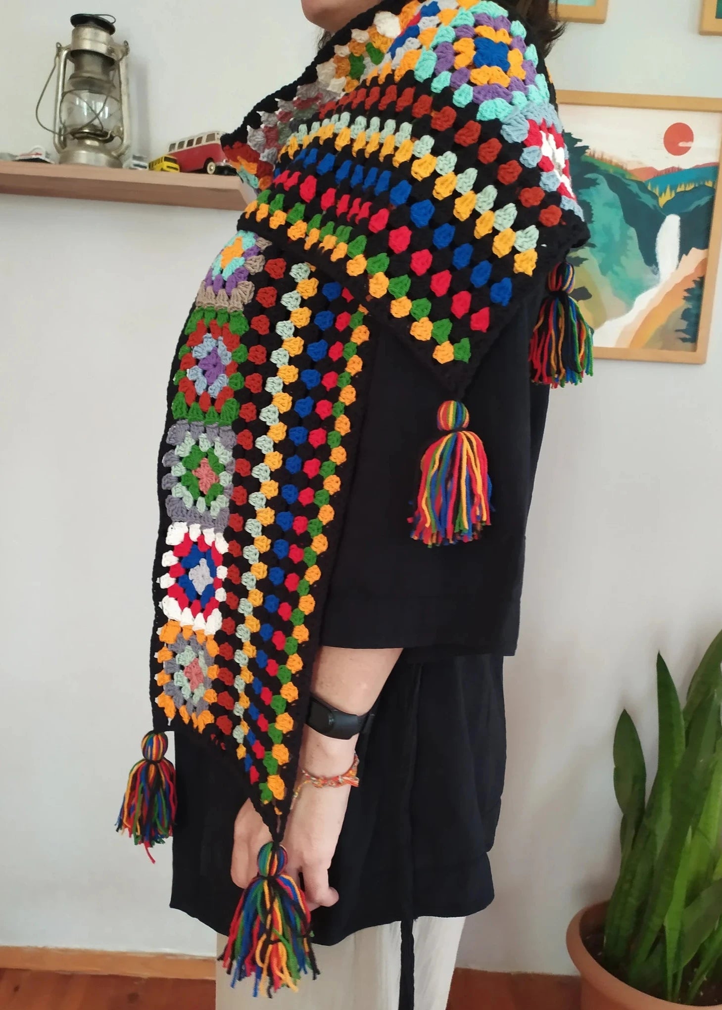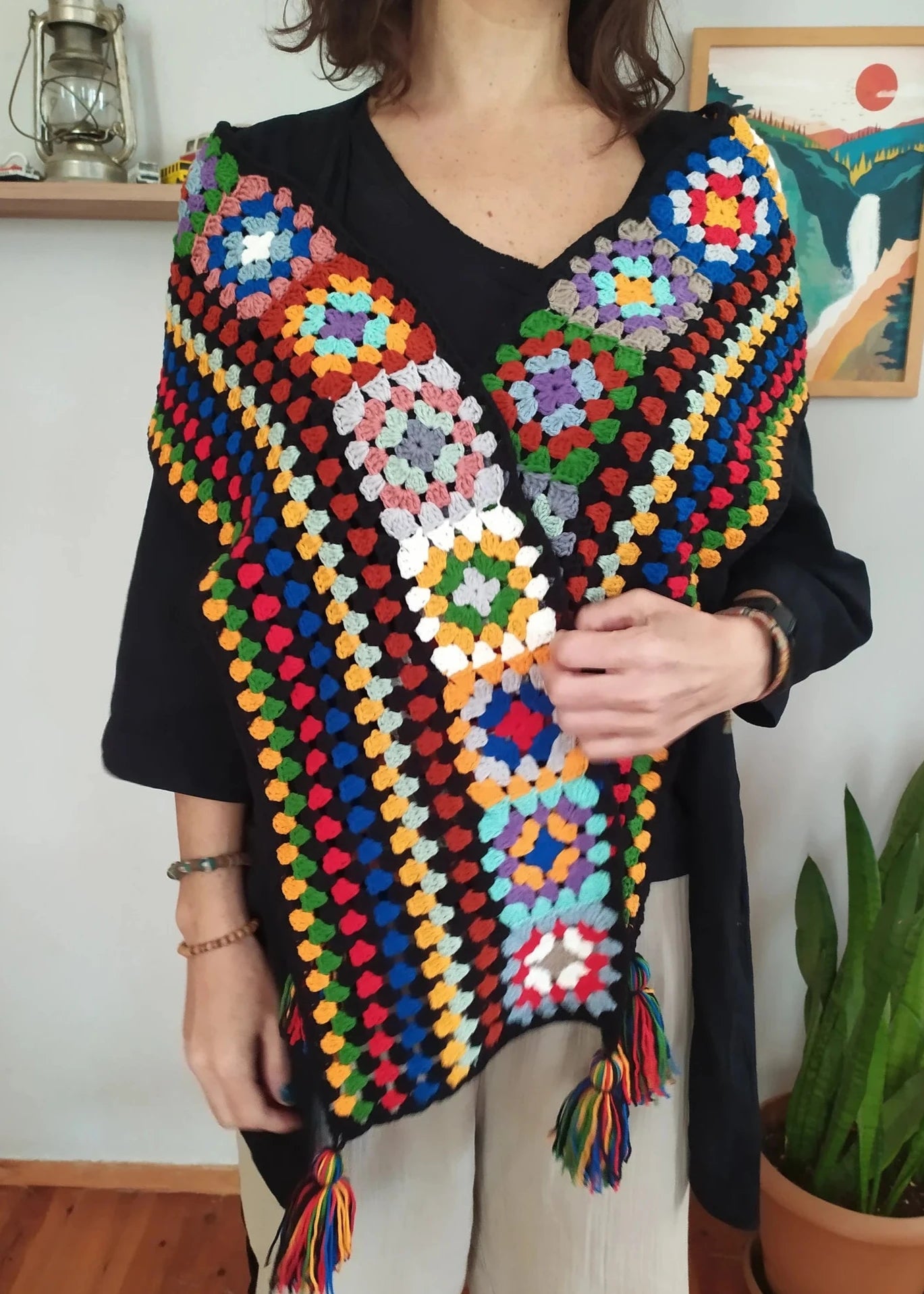 Black Granny Square Scarf, Long Winter Retro Knit Scarf, Colorful Retro Scarf, Knit Weft, Crochet Woman Scarf, Christmas Gift For Her