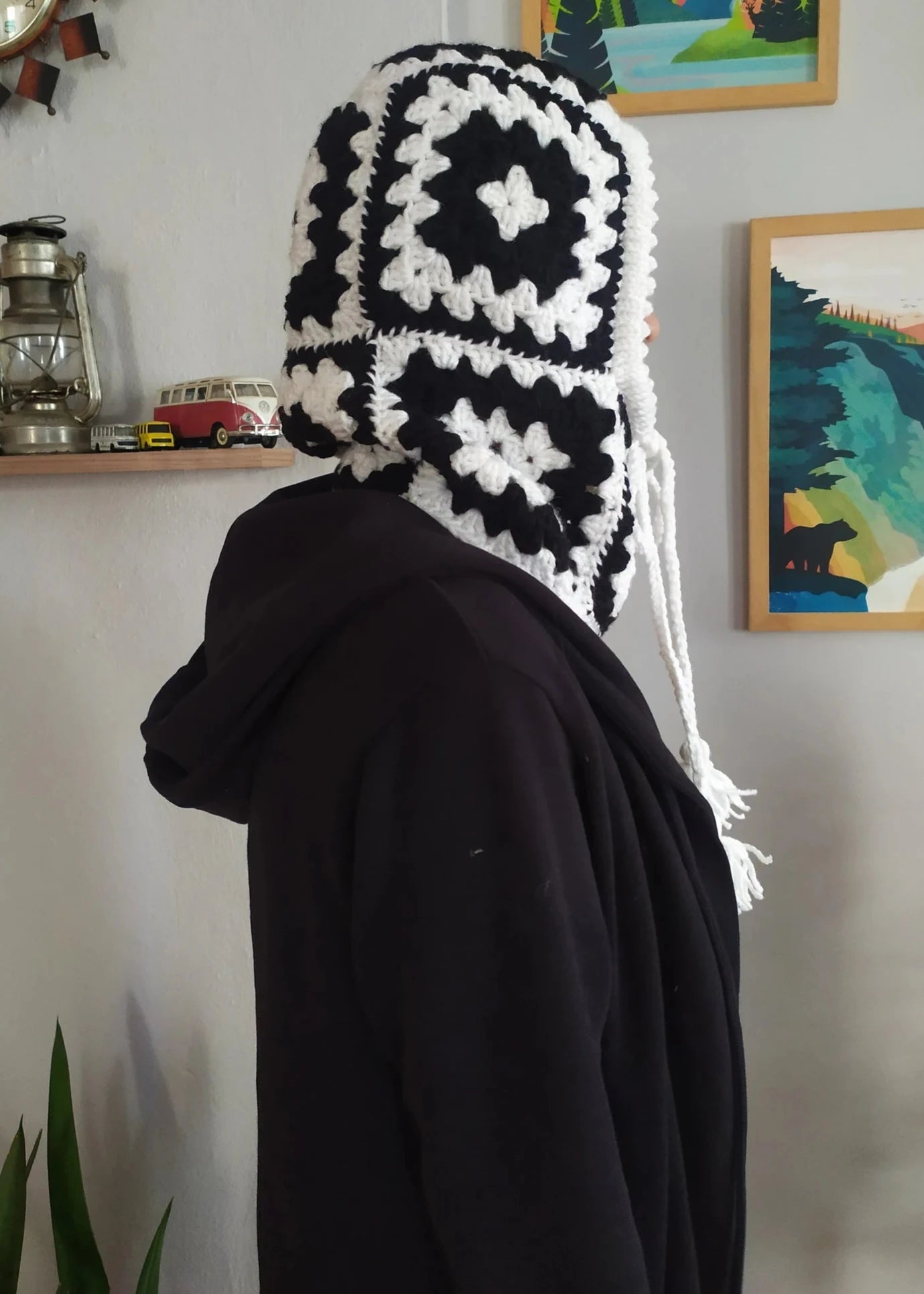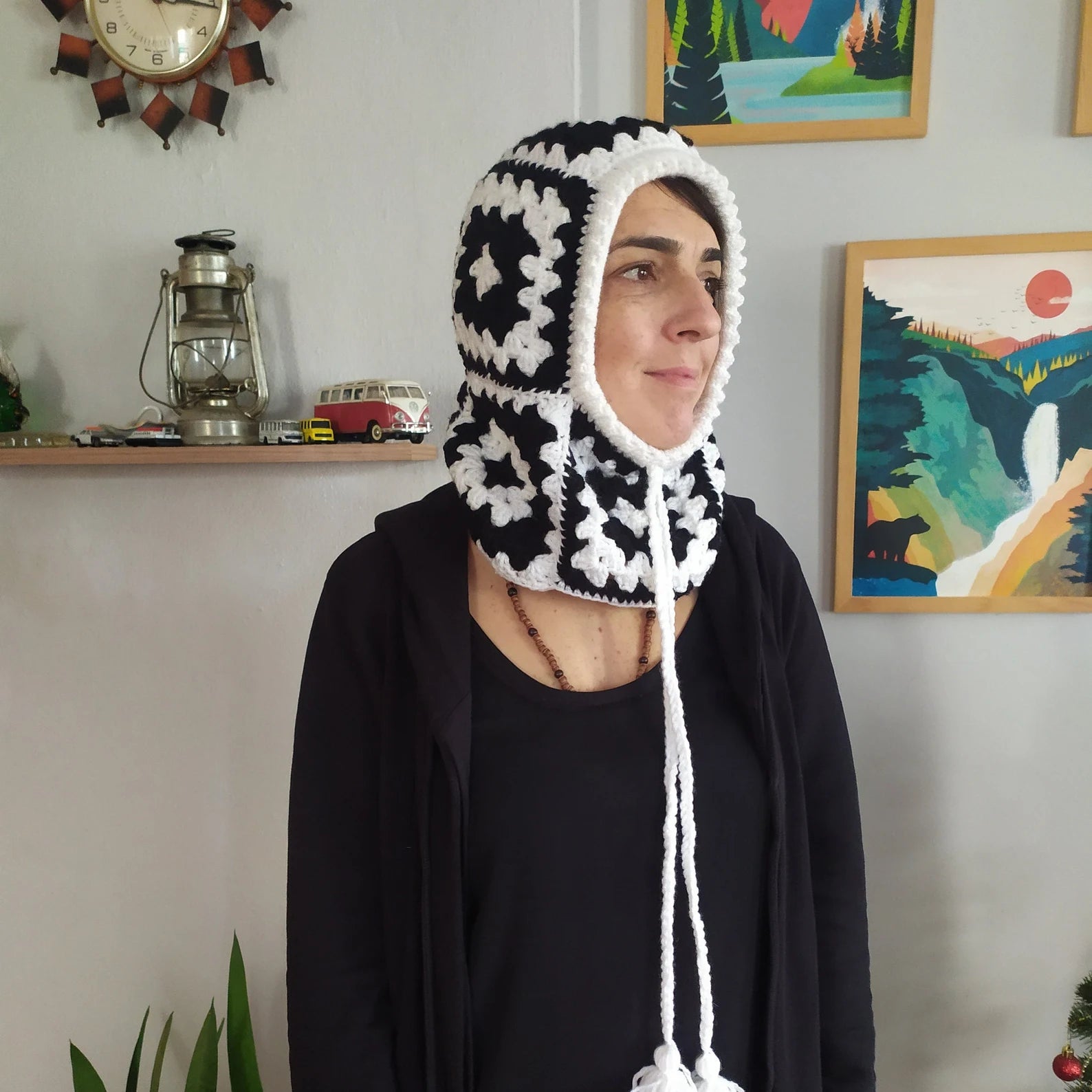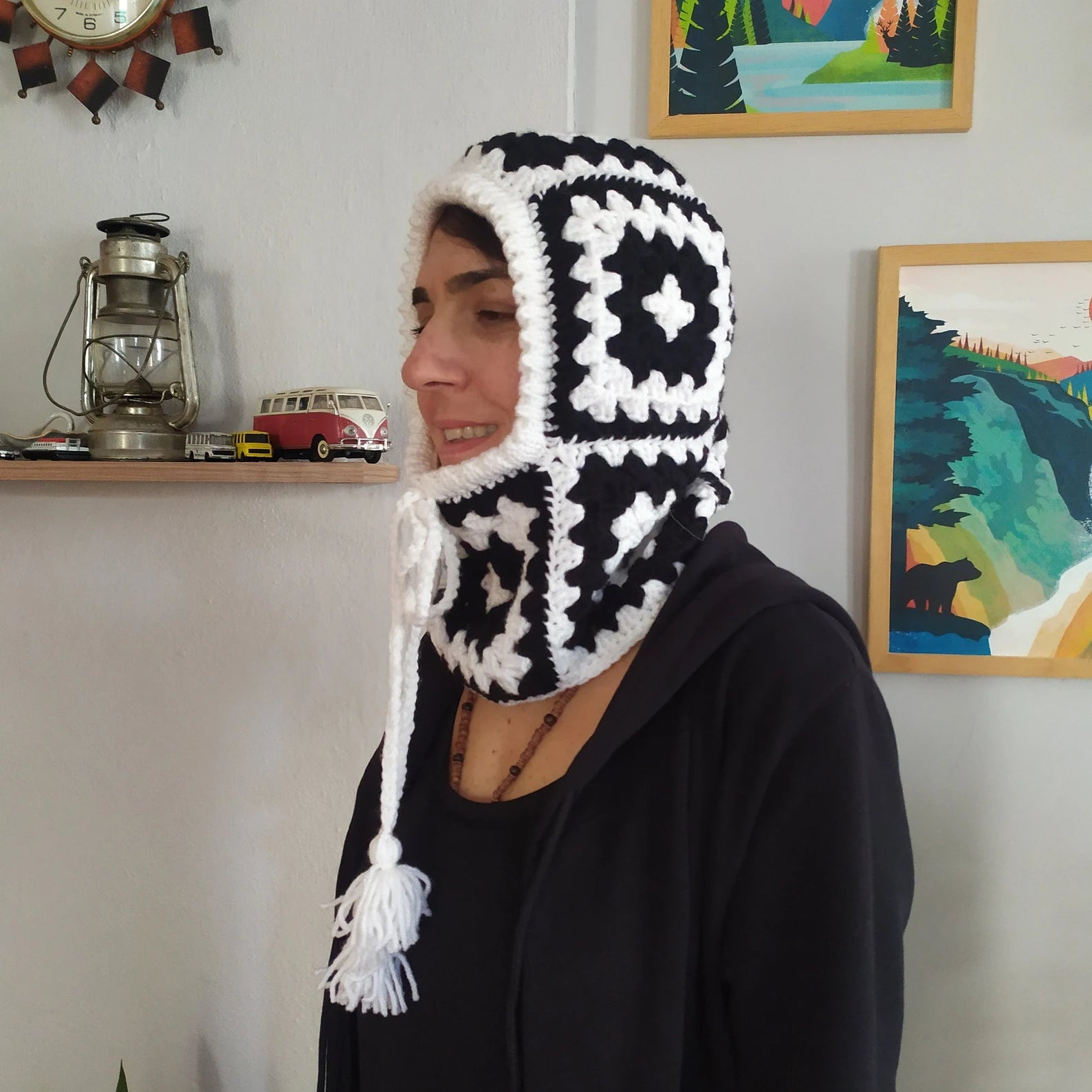 Black and White Granny Square Crochet Balaclava, Winter Clothing, Handknit Balaclava, Winter Warm Hat, Black and White Ski Mask