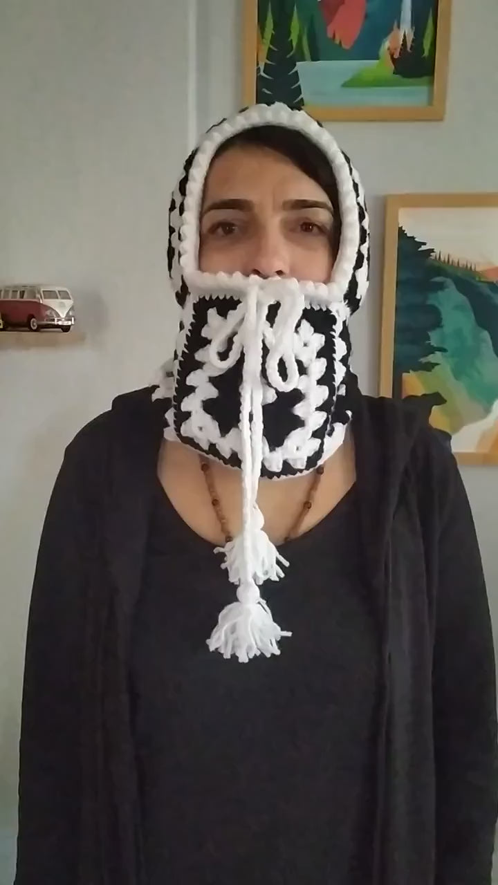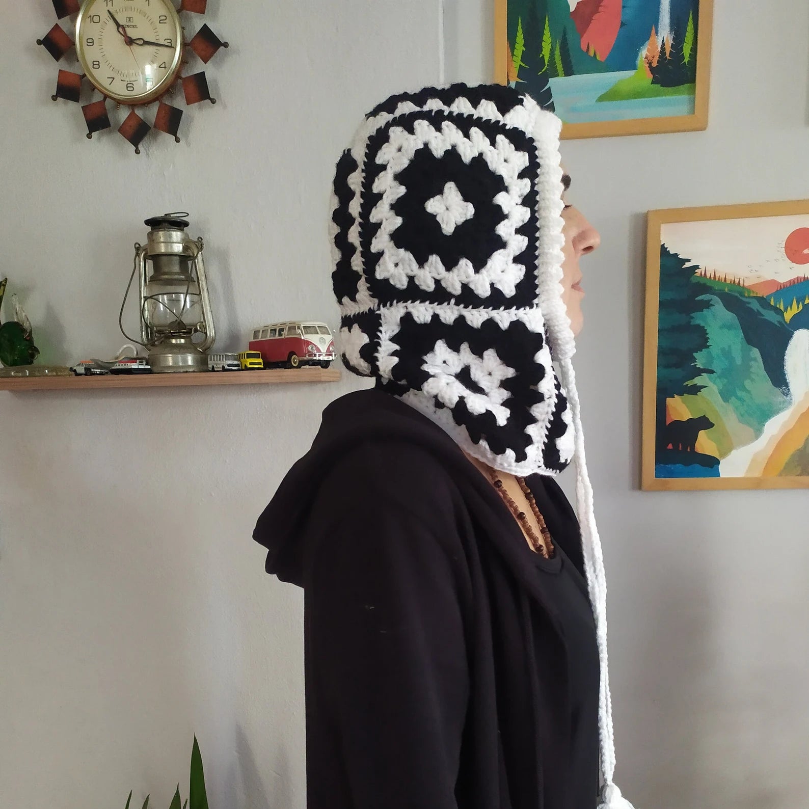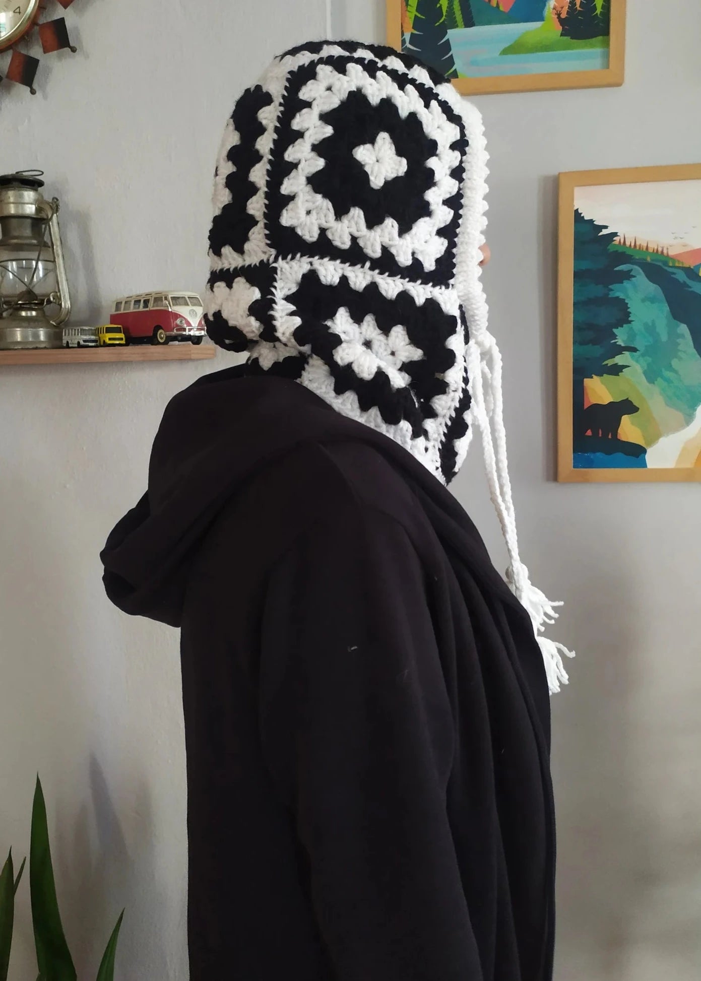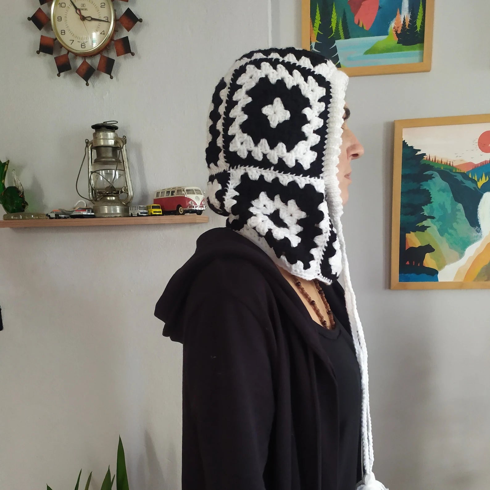 Black and White Granny Square Crochet Balaclava, Winter Clothing, Handknit Balaclava, Winter Warm Hat, Black and White Ski Mask