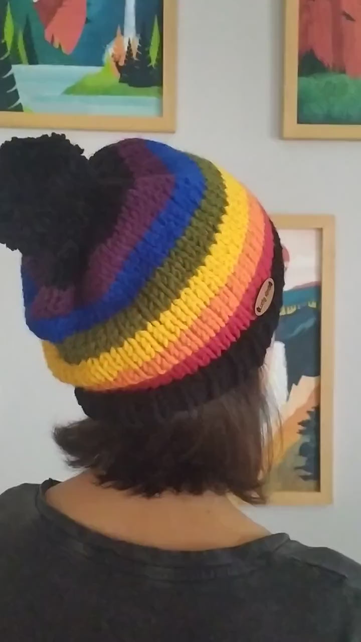 Colorful, hand-knitted rainbow winter hat with pompoms.