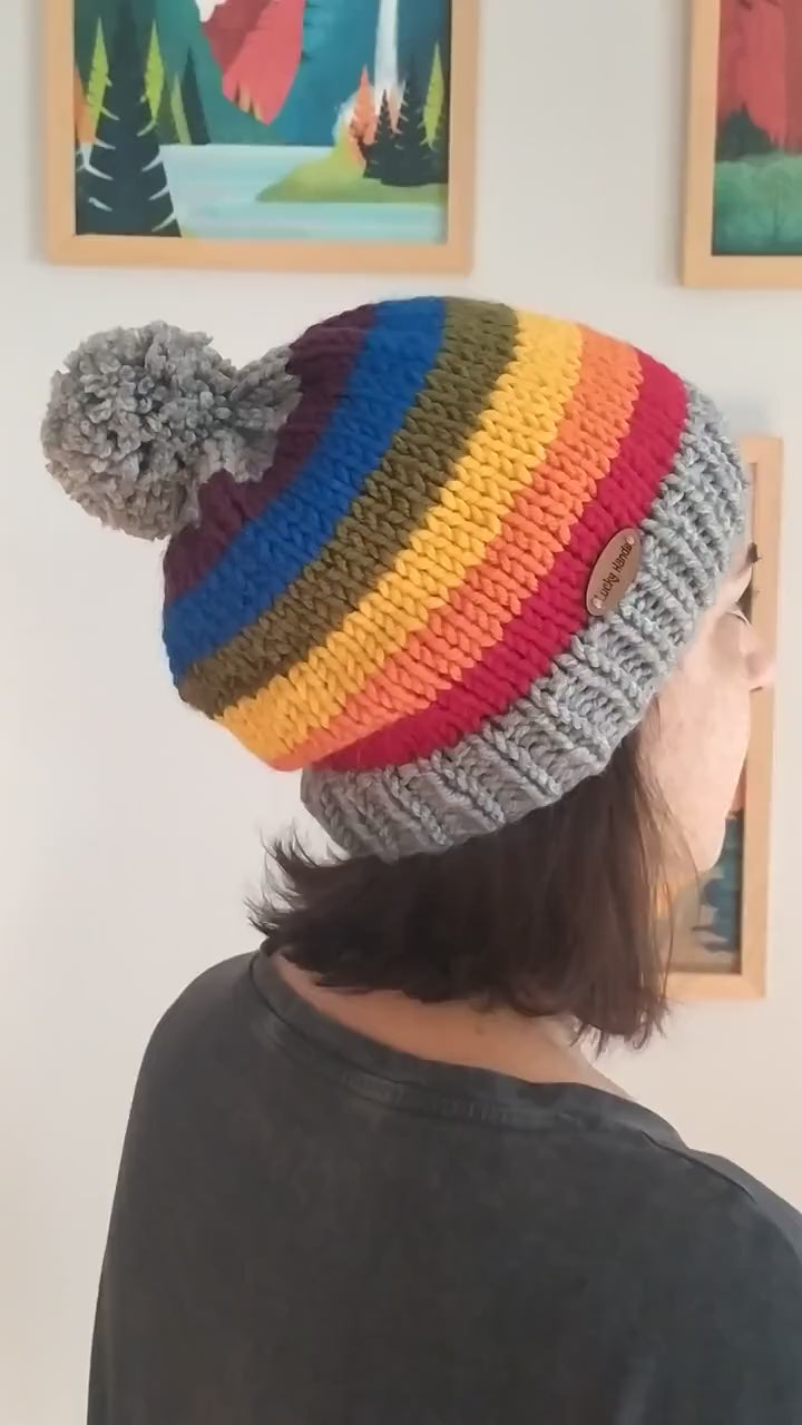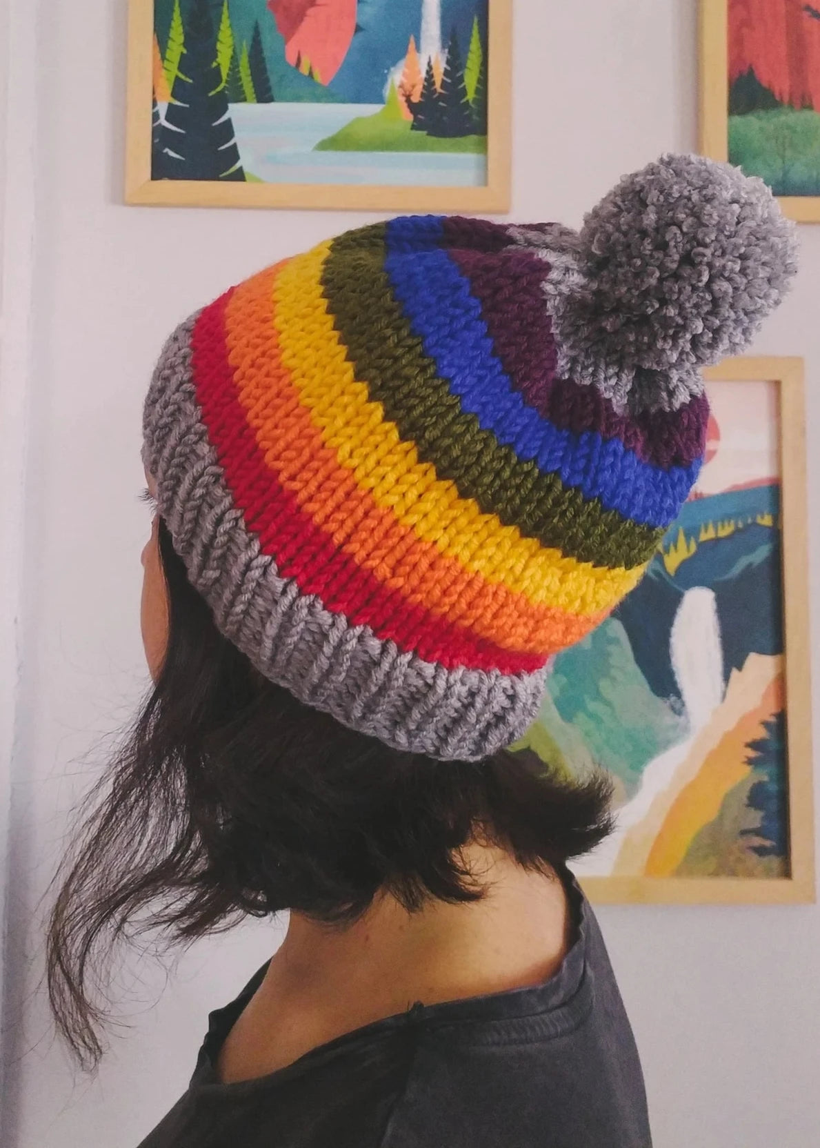 Colorful, hand-knitted rainbow winter hat with pompoms.