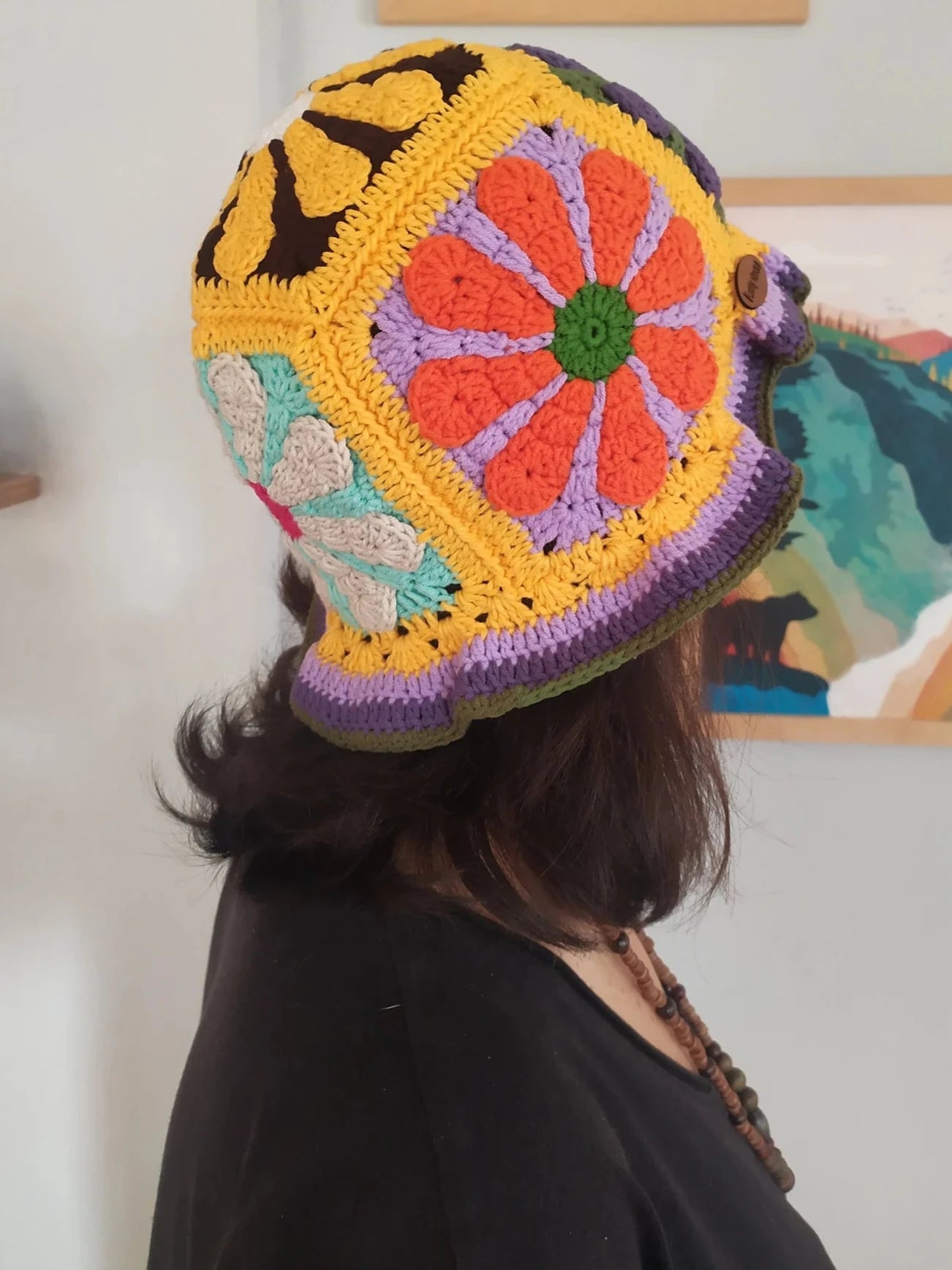 Crochet Yellow Daisy Granny Square Hat, Flower Hippi Crochet Hat, Summer Knit Bucket Hat, Knitted Bucket Beanie, Harry Style Yellow Hat