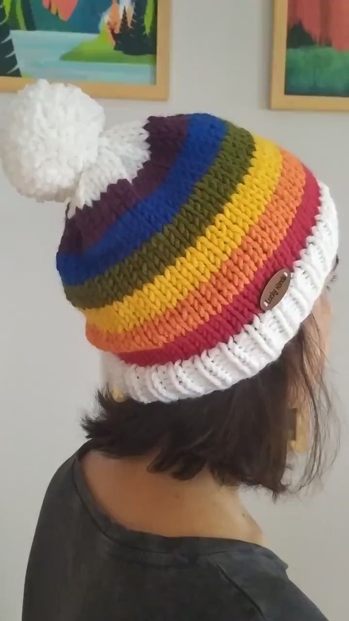 Colorful, hand-knitted rainbow winter hat with pompoms.